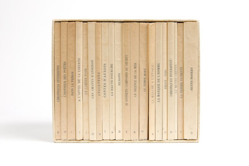 | Résumé | SANS LE COFFRET.Couverture beige rempliée. Ces volumes sont des rééditions faites entre 1944 et 1945 de textes parus initialement sous l'occupation de façon clandestine entre 1942 et 1944. Chaque volume est l'un des 1500 exemplaires sur pur fil des Papeteries de France. Chaque ouvrage porte au dos une étoile ou une lettre, l'ensemble formant : *EDITIONS*DE*MINUIT. |